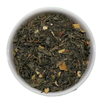 Thé vert de Chine aromatisé à la mandarine et au yuzu, parsemé de pétales de cerisier japonais, inspiré de la province de Satsuma, célèbre pour ses mandarines.
